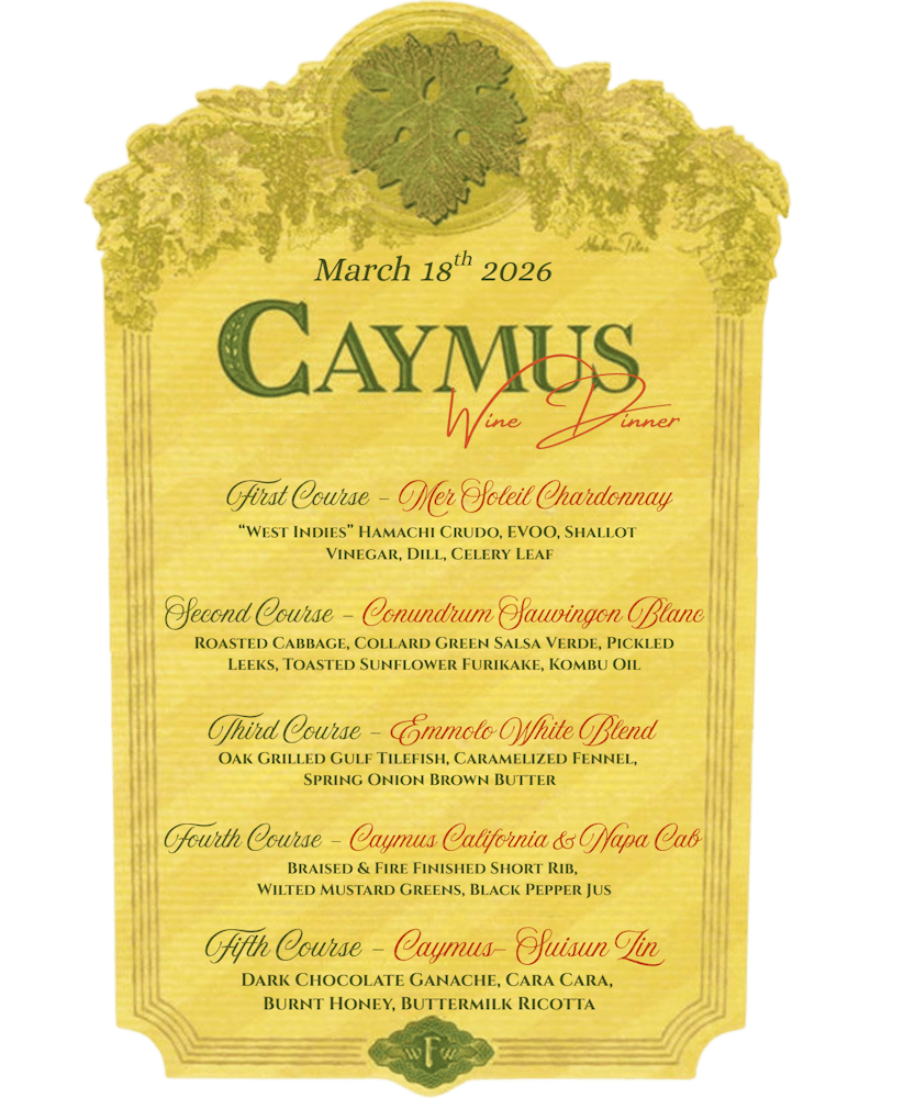 Indulge in a curated five course culinary journey, each dish complemented with the bold wines of Caymus Vineyards.